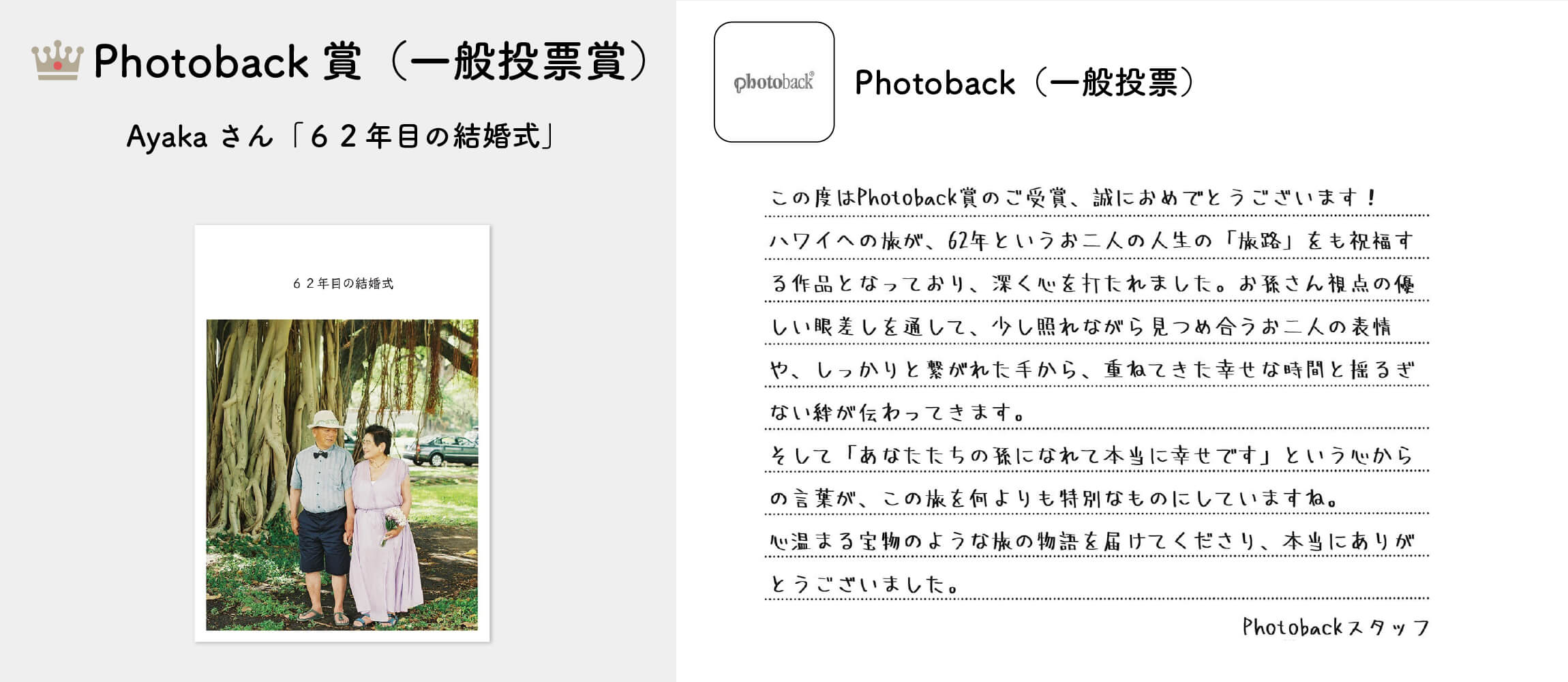 Photoback(一般投票)賞:「62年目の結婚式」 Ayaka さん