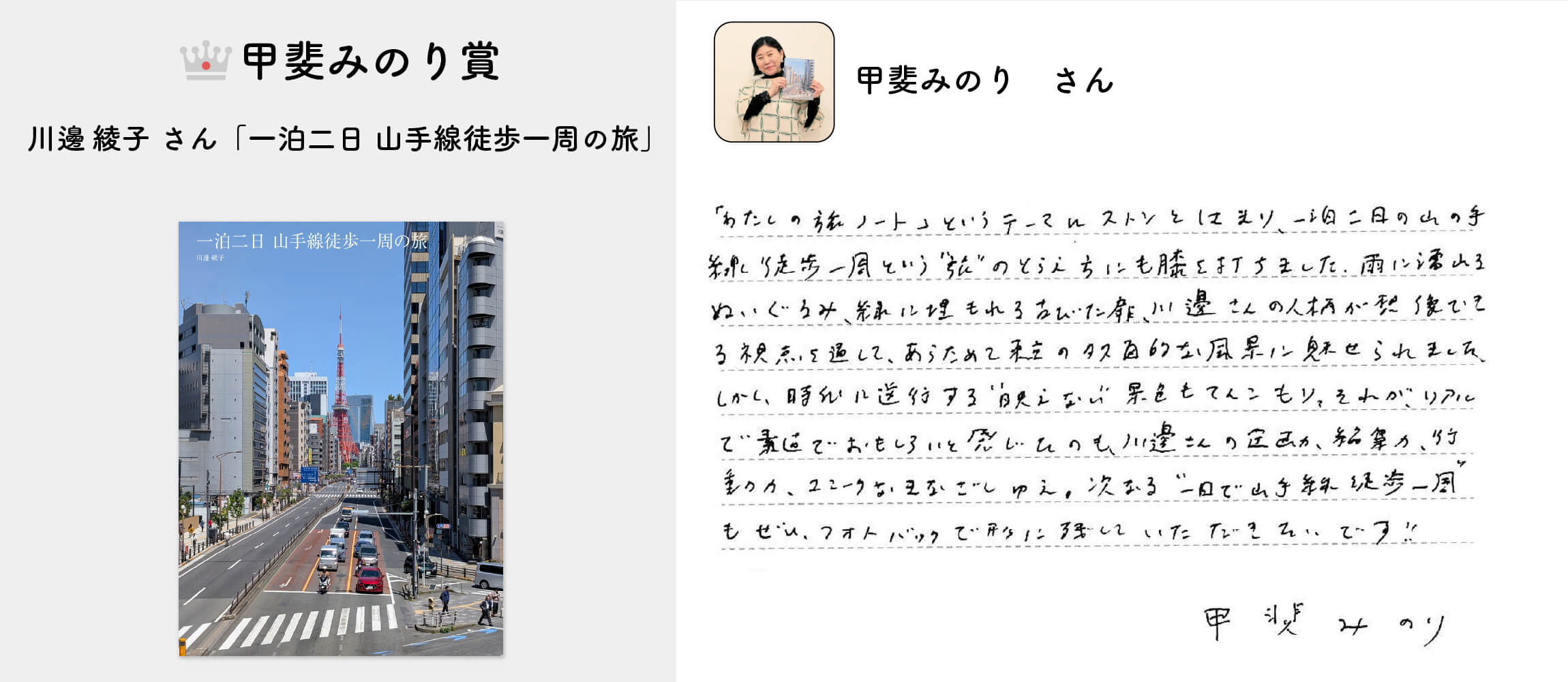 甲斐みのり賞:「一泊二日 山手線徒歩一周の旅」 川邊 綾子 さん