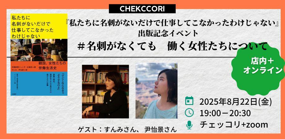 神保町にある韓国書籍専門書店「チェッコリ」は、8月22日(金)に、翻訳家のすんみさんと尹怡景(ゆん・いぎょん)さんをお招きして、注目の新刊『私たちに名刺がないだけで仕事してこなかったわけじゃない』出版記念トークイベントを開催いたします。