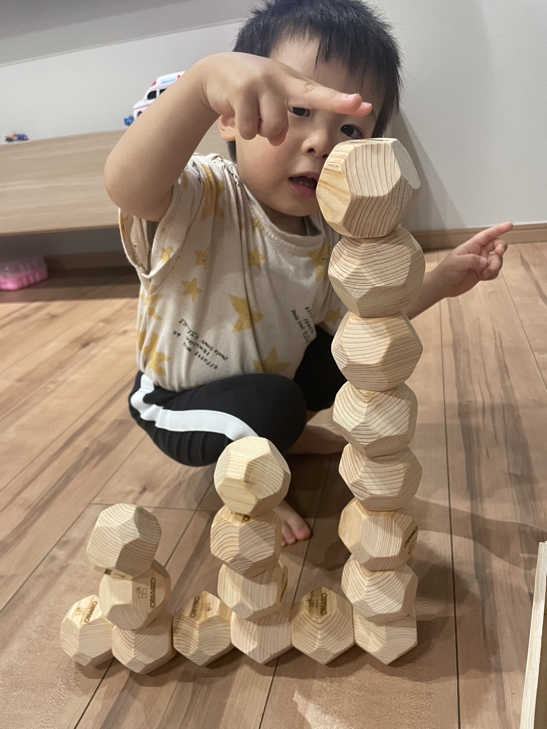 通常の四角い積み木とは異なる18面体の球体状になった形が、創造力と集中力を自然と引き出し、大人も子どもも時間を忘れて遊んでしまうという“魔法”のような国産木製玩具です。