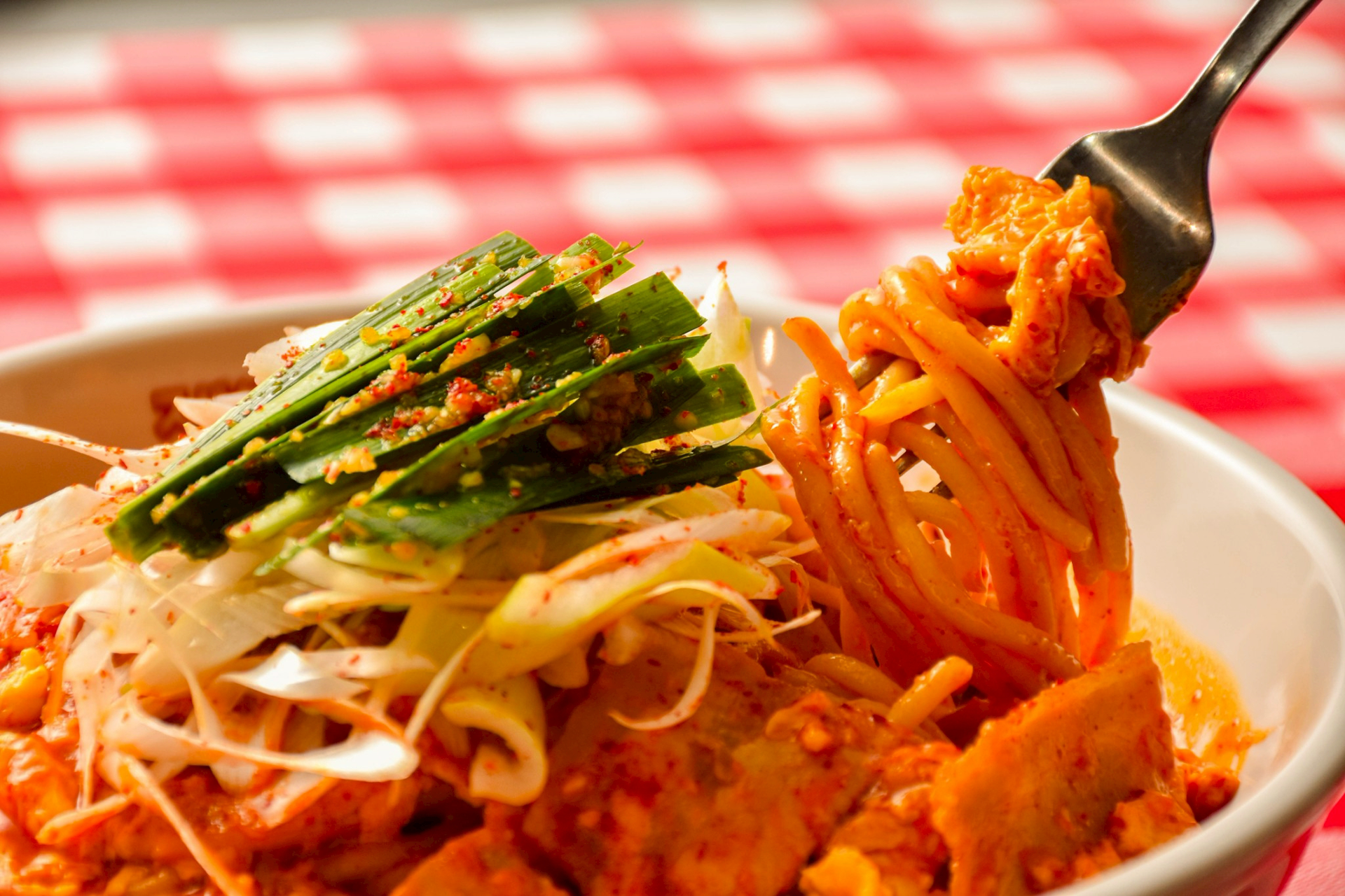 今年の夏も記録的な暑さ、ただ過ごしているだけで体力をガンガンけずられがち。暑すぎて食欲減退、夏バテ気味のみなさんのためにも、おいしいがっつり系の活力サポートメニュー「スタミナ辛たまスパ」を開発しました。にんにくと唐辛子をじっくりと炒めた鶏ガラベースで溶き卵をトロっと混ぜて優しいとろみづけをした特製あんをパンチョの極太麺にたっぷり注いだあんかけ風スパゲッティースタイル。具材には豚バラ肉を、そして辛味ネギとニンニクにらを後乗せトッピングし旨辛をさらにプラスしました。