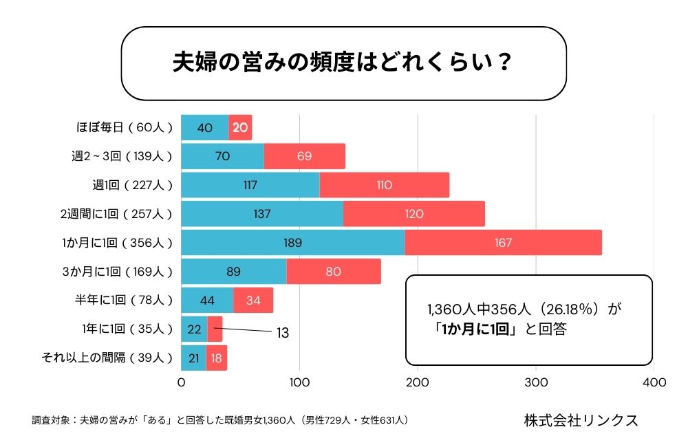 夫婦の営みが「ある」と答えた1,360人(男性729人・女性631人)に、その頻度について尋ねました。
