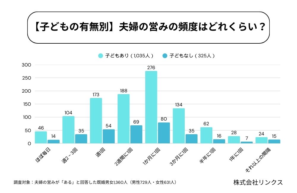「子どもがいる/いない」ごとの営みの頻度を見たところ、どちらのグループも「1か月に1回」が最多となりました。