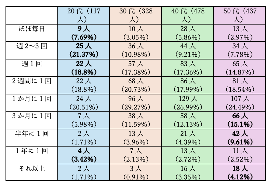 高頻度(週2回以上)の割合が最も高かったのは20代ですが、「1年に1回以下」と答えた人も20代で一定数存在するなど、傾向には個人差が見られます。