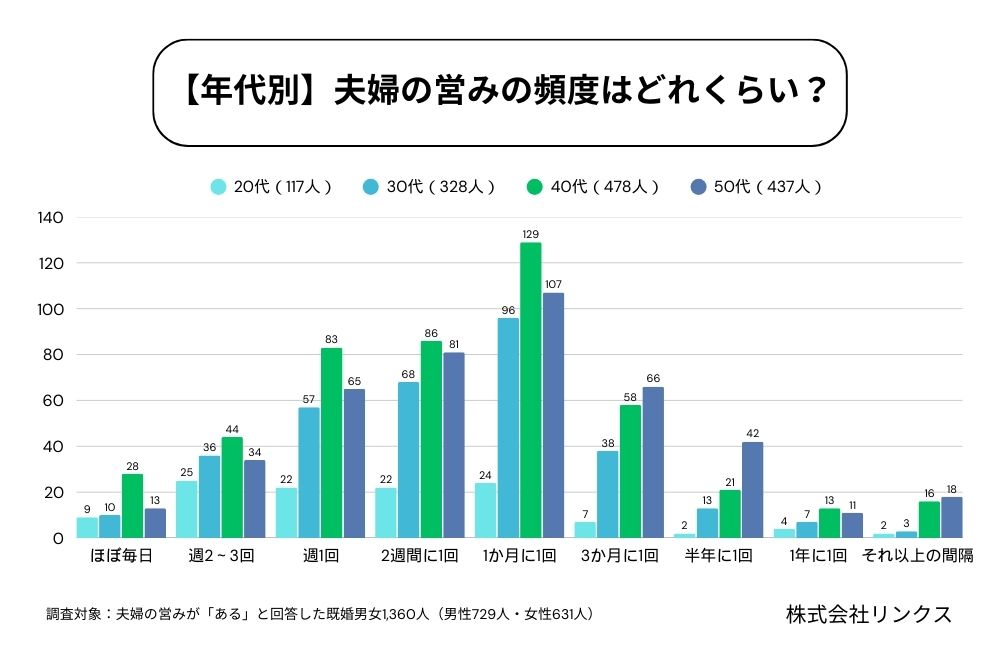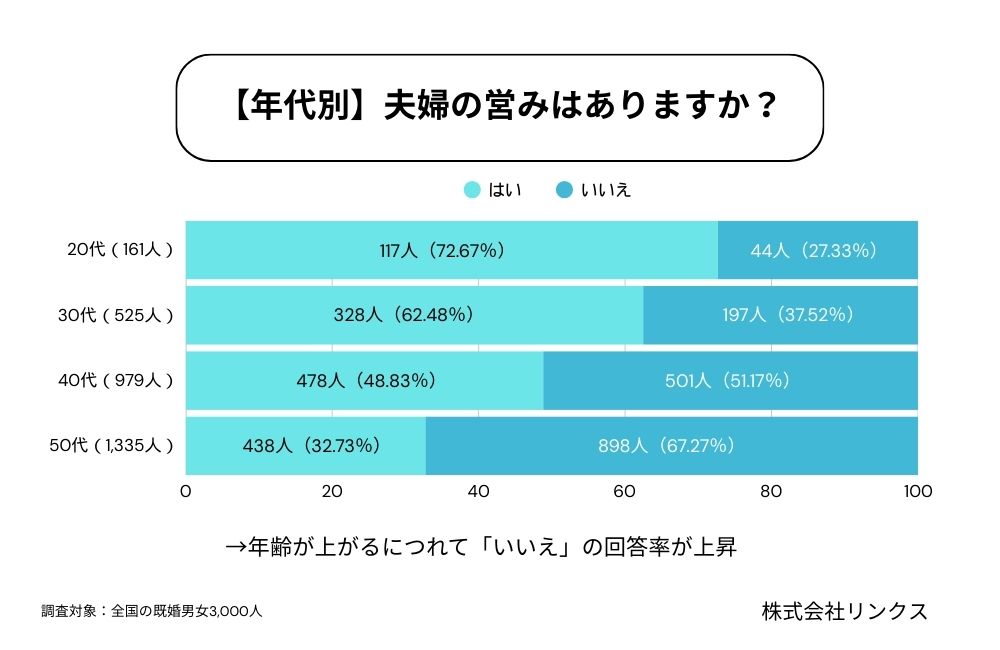 既婚者向けマッチングアプリ「既婚者クラブ」のユーザーを対象に、株式会社リンクス(東京都港区)が全国の20歳〜59歳の既婚男女3,000人を中心に、「夫婦の営み」に関するアンケート調査を実施しました。