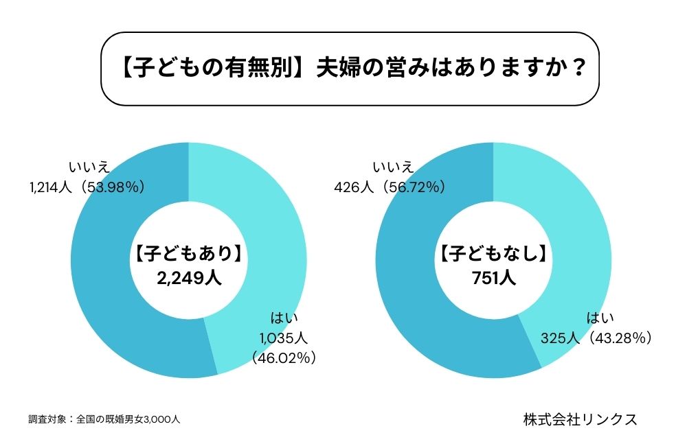 子どもがいる・いないにかかわらず、夫婦の営みの有無はそれぞれの家庭事情に左右されるのかもしれません。