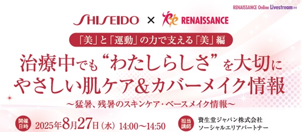 株式会社ルネサンス(本社:東京都墨田区、代表取締役社長執行役員:望月 美佐緒、以下「当社」)は、当社が取り組む「がん患者のQOL(クオリティー・オブ・ライフ=生活の質)を高めるためのがん患者支援」の一環として、資生堂ジャパン株式会社(以下「資生堂」)が実施する「資生堂ライフクオリティー ビューティー活動」と連携し、2025年8月27日(水)にセミナーを共催します。がん治療の副作用による肌悩みや肌色の変化に応じた「治療中でも”わたしらしさ”を大切に やさしい肌ケア&カバーメイク情報」をテーマにお届けします。