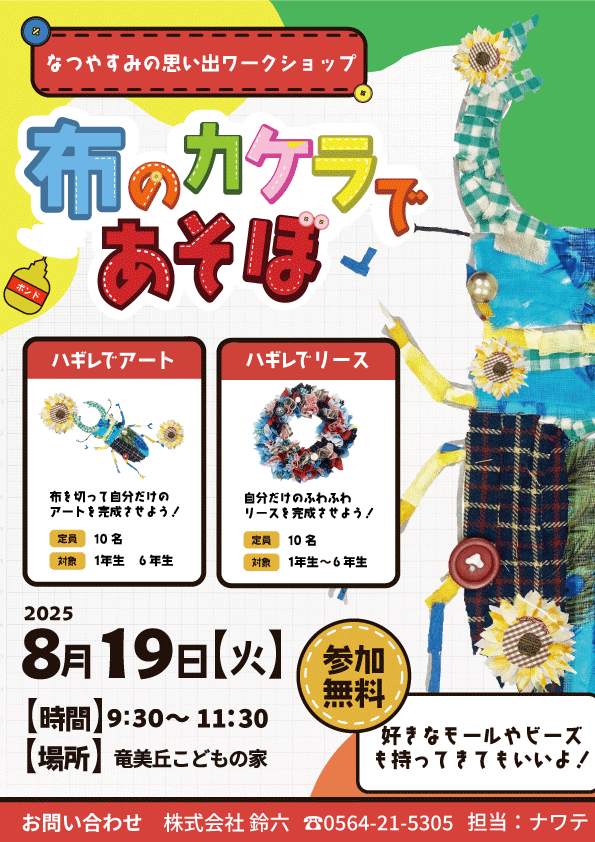 株式会社鈴六(本社:愛知県岡崎市 代表取締役社長 鈴木和人)は、2025年8月19日、岡崎市竜美丘「こどもの家」にて、小学生を対象にした無料のアート体験イベント「ハギレのアートとハギレのリース」を開催いたします。 夏休みの思い出づくりや自由研究にもぴったりな本イベントは、使わなくなった布の“ハギレ”を使って、自由な発想で作品をつくるワークショップです。