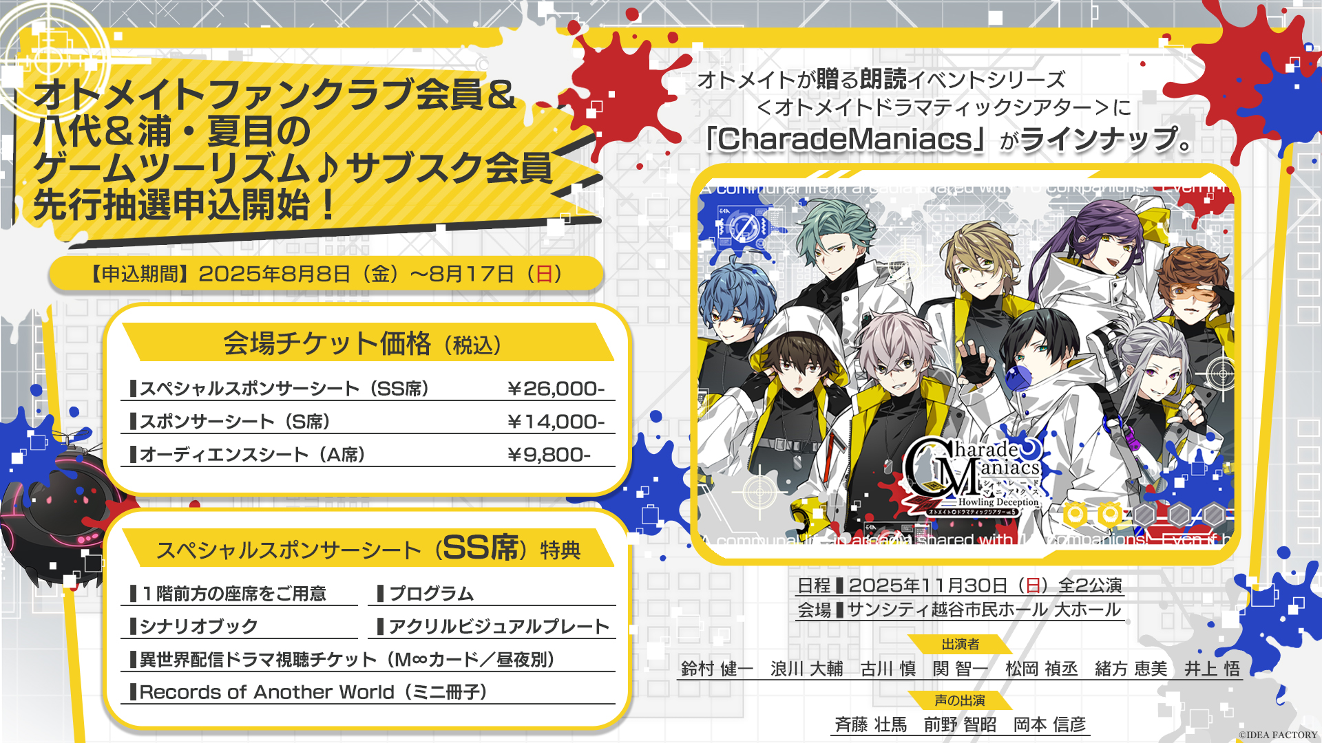 アイディアファクトリー株式会社(代表取締役社長:佐藤 嘉晃/所在地:東京都豊島区)の女性向けゲームブランド「オトメイト」は、2025年11月30日(日)にサンシティ越谷市民ホール 大ホールにて開催する、オトメイトドラマティックシアターvol.05「CharadeManiacs -Howling Deception-」の「オトメイトファンクラブ会員/八代&浦・夏目のゲームツーリズム♪サブスク会員」先行抽選の申込みを本日より開始いたしました。