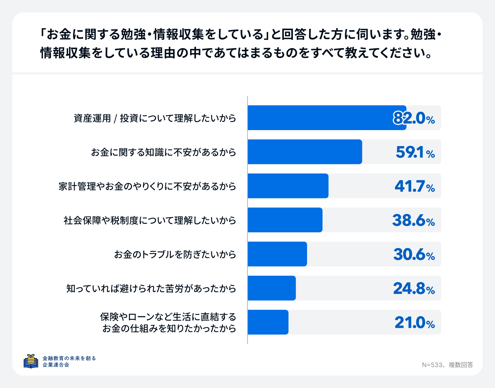 お金を勉強する理由として最も多かったのは「資産運用・投資について理解したい(82.0%)」でした。次いで「知識に不安がある(59.1%)」「家計管理に不安がある(41.7%)」が続きました。具体的な目的と漠然とした不安の両面から形成されています。