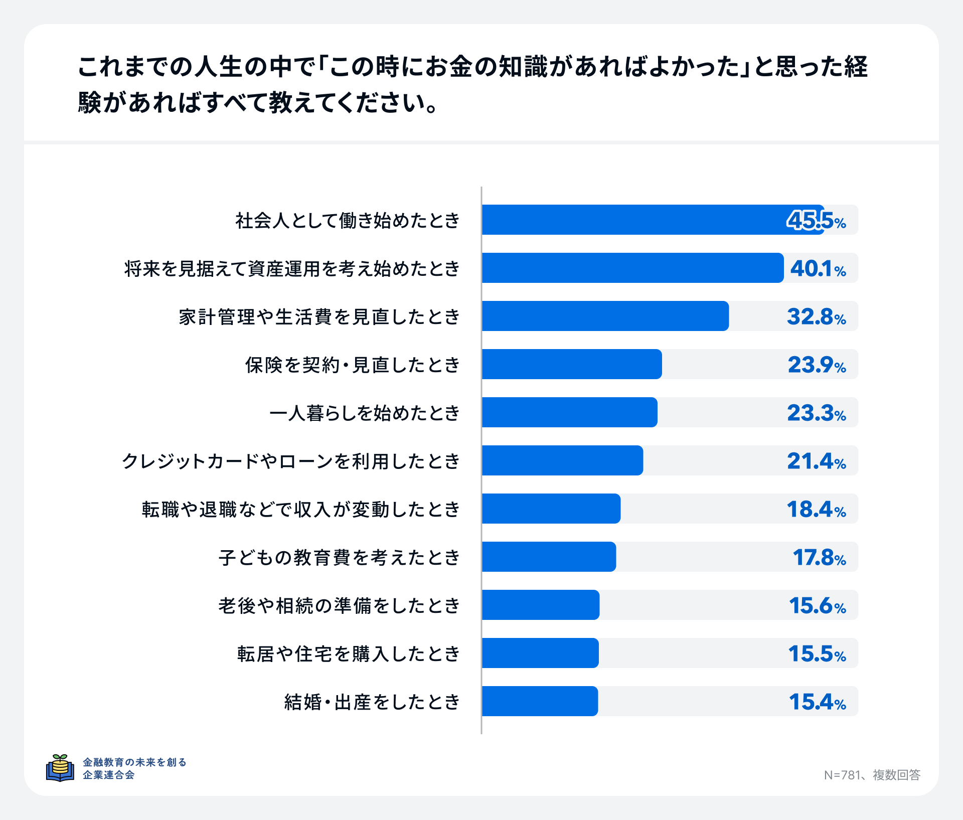 また「お金の知識があればよかった」と感じた場面では「社会人として働き始めたとき(45.5%)」「資産運用を考え始めたとき(40.1%)」が上位にあがり、重要なライフイベントを迎える段階で金融知識の不足を痛感していることがうかがえます。