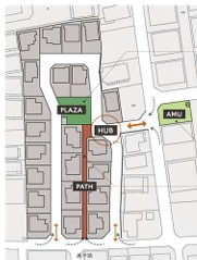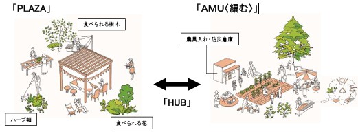 「AMU」と「PLAZA」をつなぐ「HUB」 (交差点)を含めたオープンスペースを利用して野菜の収穫祭やマルシェ等のイベントを行う予定です。こうした活動は、これまで接点が少なかった新旧の住民のつながりを深め、地元とのつながりを持たせることができます。地域の暮らし文化の創造や、担い手不足という自治会の課題への取り組み、防災や防犯にすぐれたネットワーク形成等、画一的な分譲地づくりではできない新しい街づくりがスタートします。