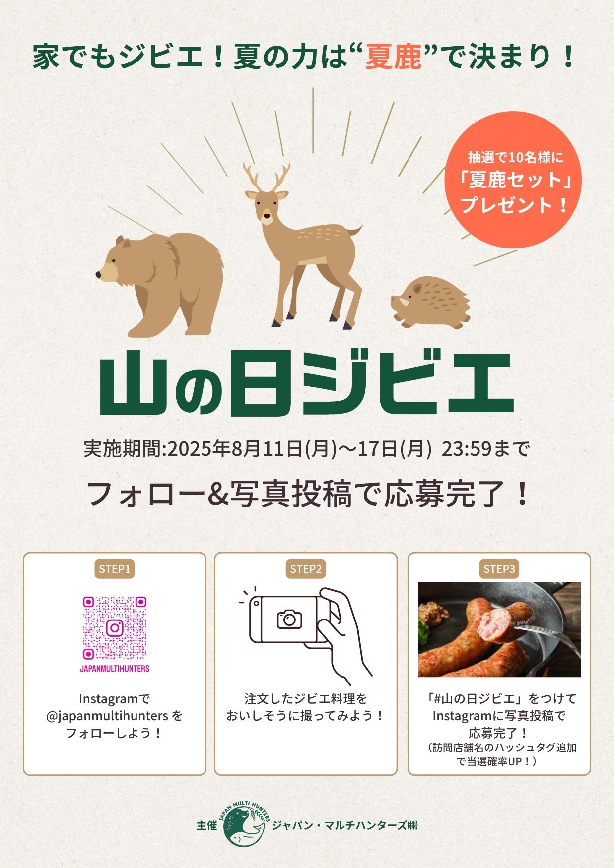 ジャパン・マルチハンターズ株式会社は、2025年8月11日(山の日)より、17日まで全国の飲食店と連携した「山の日ジビエキャンペーン」を開催いたします。約30店舗が参加し、期間中に対象店舗でジビエ料理を注文しInstagramに投稿いただいた方から抽選で10名様に「ジビエセット」をプレゼントします。ジビエを味わうことを通じて、日本の森林保全や鳥獣被害対策の重要性を広く伝えていきます。