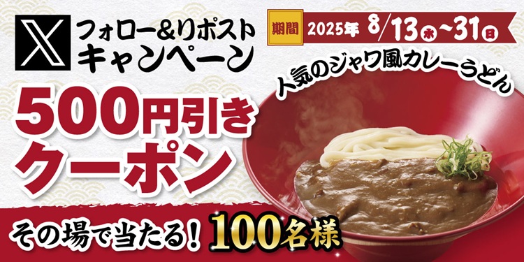 株式会社家族亭(本社・大阪府大阪市、代表取締役社長・坪山 憲司)が運営するうどんチェーン「得得(とくとく)」は、2025年8月13日(水)午後8時~8月31日(日)の期間限定で、「得得デジタルクーポン(500円引き)」がその場で当たる「Xフォロー&リポストキャンペーン」を実施いたします。