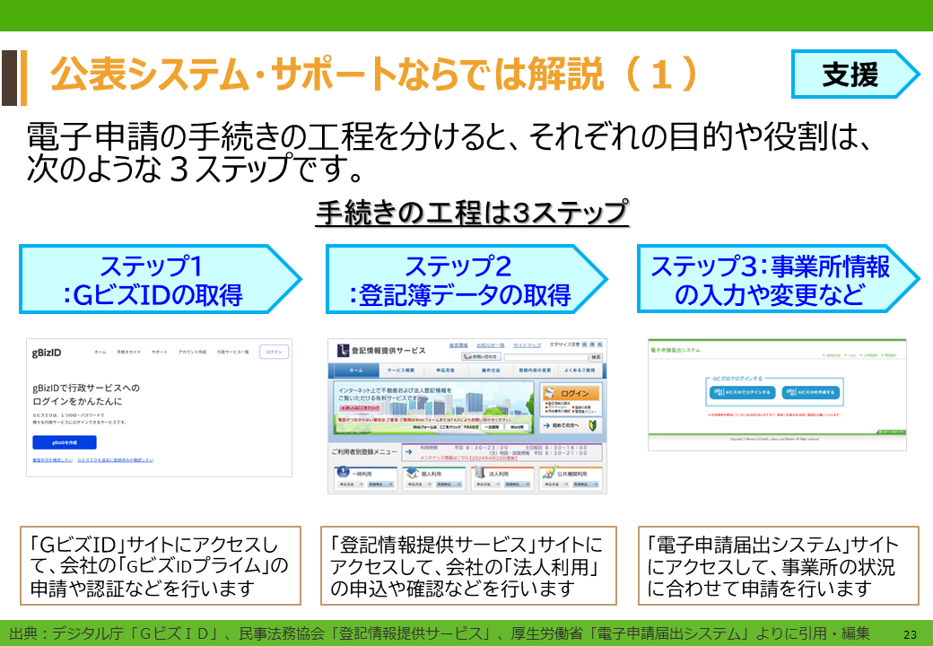 そして初めて利用する方向け「電子申請のすゝめ」をテーマに、電子申請の手続きを3つのステップに分けて、ステップごとにそのシステム操作や準備すべきもの、陥りやすいNG箇所と解決策などのコンテンツをWEBサイトやYouTubeで配信していきます。(なお解説する内容については、セミナー開催時点の情報を元にしていますので、その後に変更になる場合など、あらかじめご了承ください)