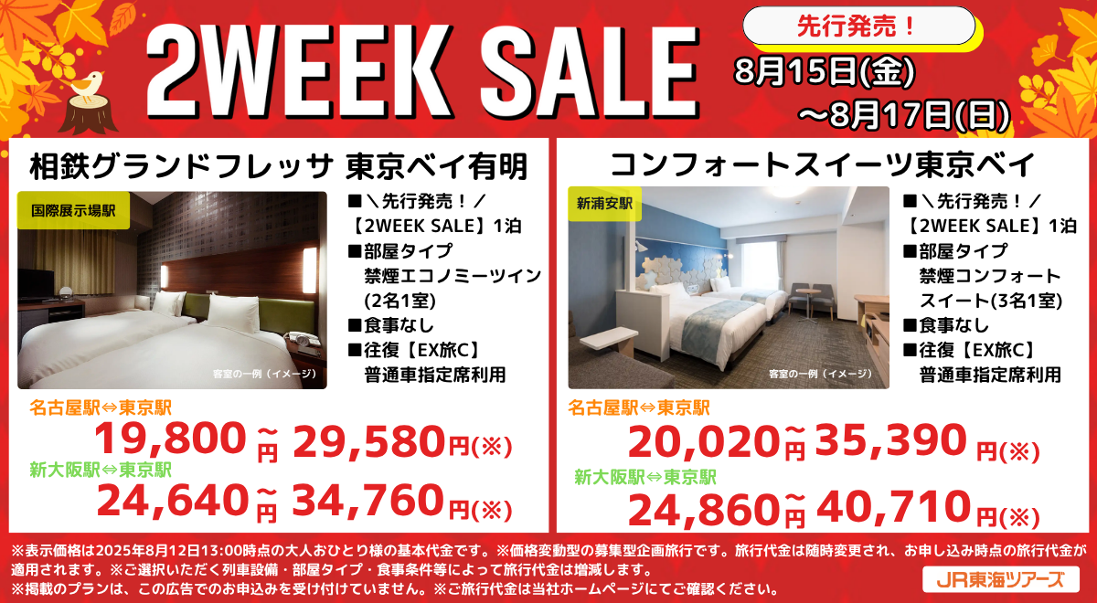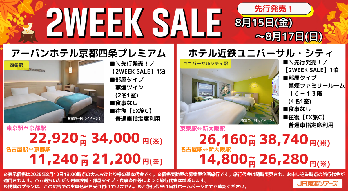 株式会社ジェイアール東海ツアーズ(本社:東京都中央区、以下JR東海ツアーズ)は、2025年8月18日(月)13時から9月1日(月)12時59分までの14日間限定で、大人気企画「2WEEK SALE」を開催いたします。10月以降の「新幹線+ホテル」を使ったご旅行がお得に買えるチャンス!また、LINEアカウント連携をしていただいている方を対象に8月15日(金)より人気ホテルなど一部プランを先行発売いたします。 本セール開催に先駆け8月14日(木)昼12時より2時間限定で旅行代金が50%割引になるクーポンが当たる「#2WEEK SALE 直前キャンペーン」をJR東海ツアーズ公式Xアカウントにて開催します。あなたの行きたい旅行先をコメントして50%OFFにチャレンジしてください! 新幹線の時間変更が無料で何度でも可能、また1か月以上先の旅行でも予約と同時に利用新幹線が確定するのはEX旅パックだけ!毎年混みあう10月から12月の秋の新幹線旅行はお得なEX旅パック「2WEEK SALE」を必ずチェック!