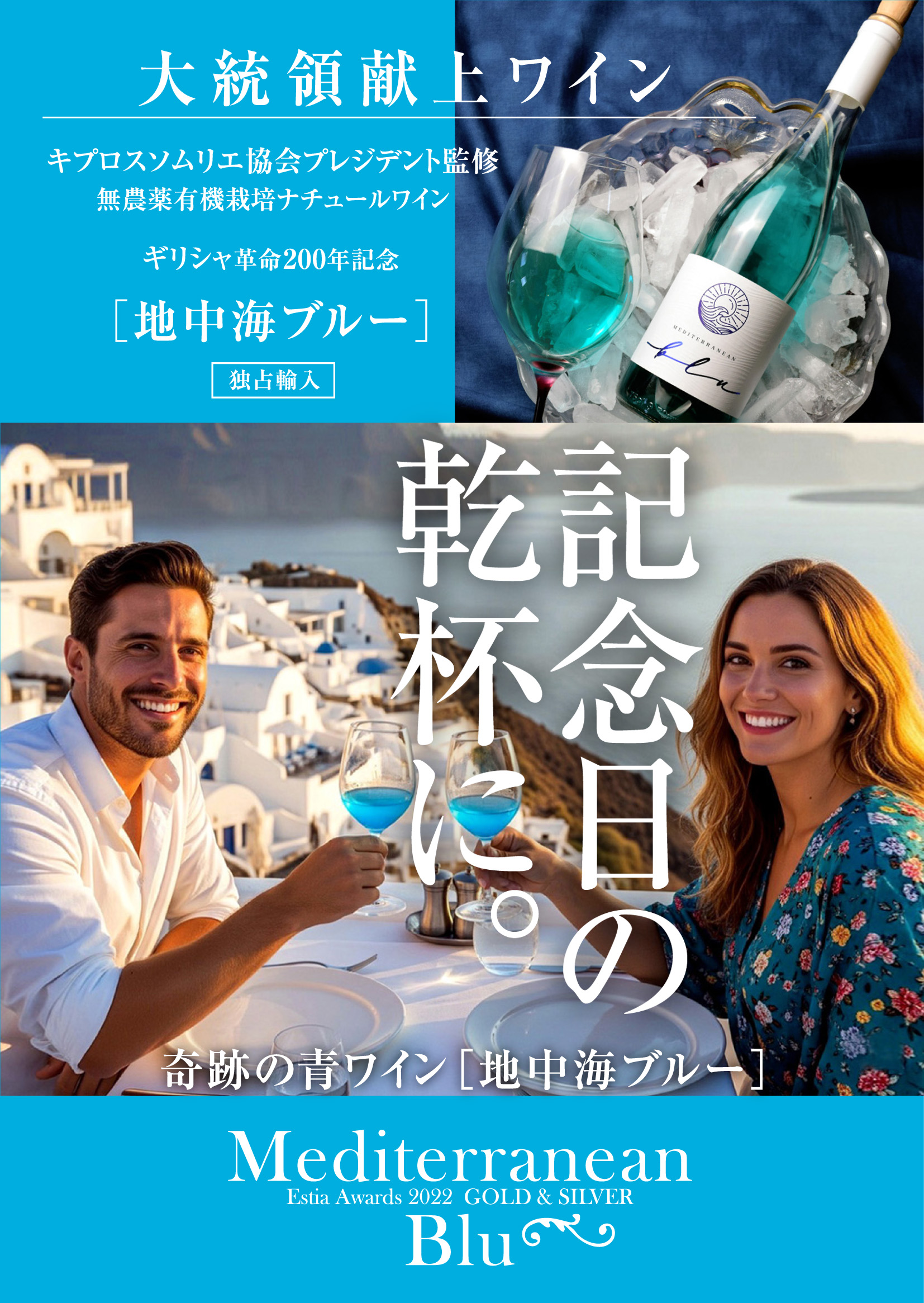 ギリシャ神話の伝説の島、キプロスの青ワイン[地中海ブルー]を日本正規独占輸入!プレスリリース専用URLにて、特別価格で限定販売! キプロスソムリエ協会プレジデント監修、欧州各国「大統領献上ワイン」をご結婚や記念日などの贈り物に、華やかなシーンの乾杯にご利用ください。