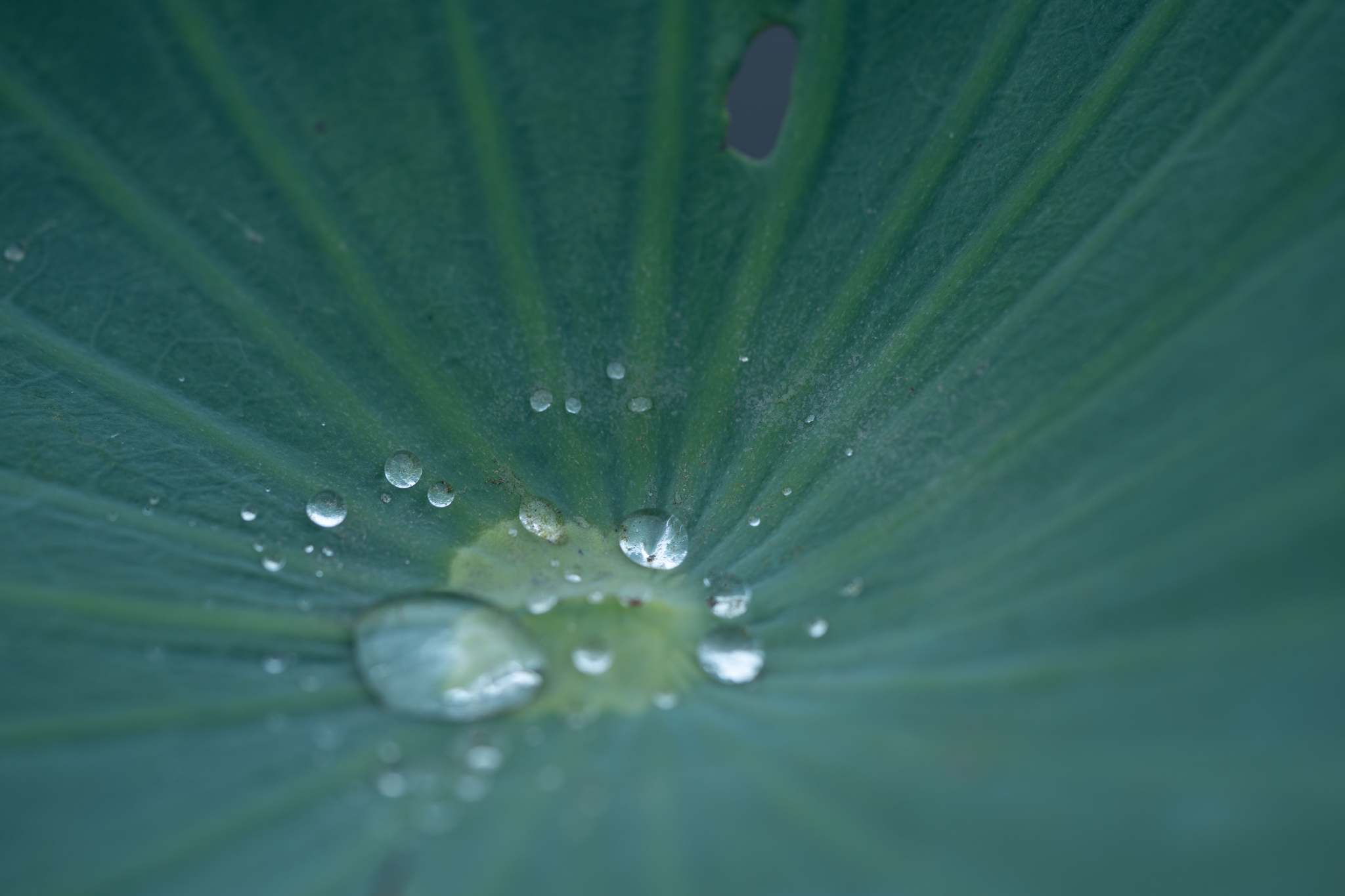 大きな蓮の葉の上でコロコロと転がる水の粒