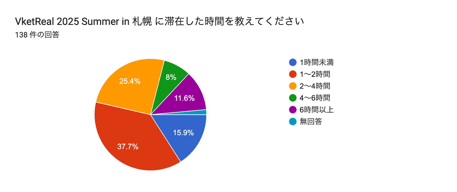 来場者アンケートによると、来場者の方の83%ほどが道内からの人が占めており、道内の方からの本イベントの注目度の高さが伺えます。また、滞在時間は2時間未満が半数を占める一方で、2時間以上滞在して交流を楽しまれる方も多く見られます。本イベントは道内では珍しいVRSNSを題材としたイベントであるため、北海道のVRSNSユーザーのハブとして機能したことが伺えます。