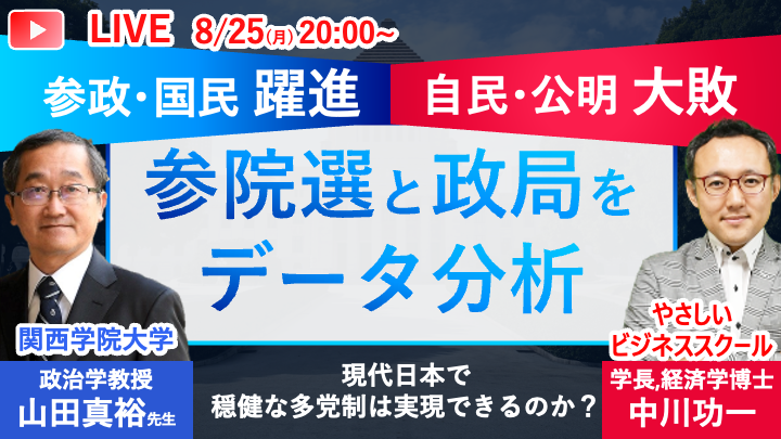 やさしいビジネススクールでは、8月25日(月)20時より、YouTube無料ライブ「参院選と政局をデータ分析