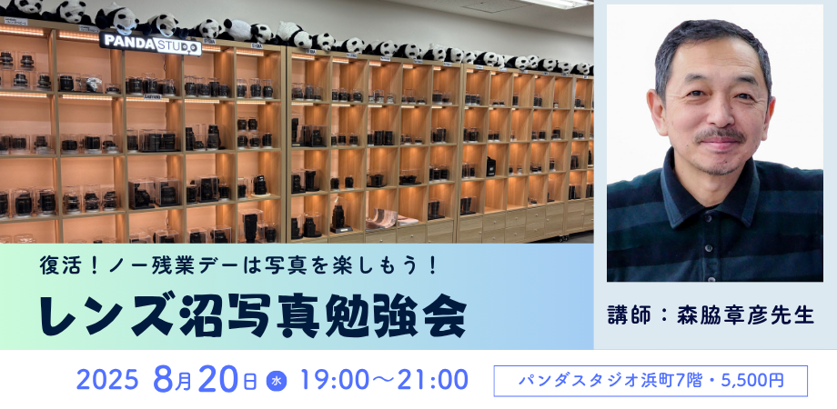 株式会社プロ機材ドットコム(本社:沖縄県那覇市)は、2025 年 8 月 20 日(水)にパンダスタジオ浜町 7F にて、パンダスタジオ・レンタル様との協業で「ノー残業デーは写真を楽しもう!レンズ沼写真教室」を開催します。 人気写真教室が待望の復活!プロ写真家・森脇章彦氏を講師に迎え、専門用語を使わず、初心者から上級者まで誰もが自分のデジタルカメラで直感的に学べる実践的な講評教室です。撮影した写真を持ち寄り、一人一人に丁寧なアドバイスを受けながら、カメラの基本操作や撮影テクニックを楽しく身につけられます。仕事帰りの水曜日、心地よい時間を写真とともに過ごしませんか?