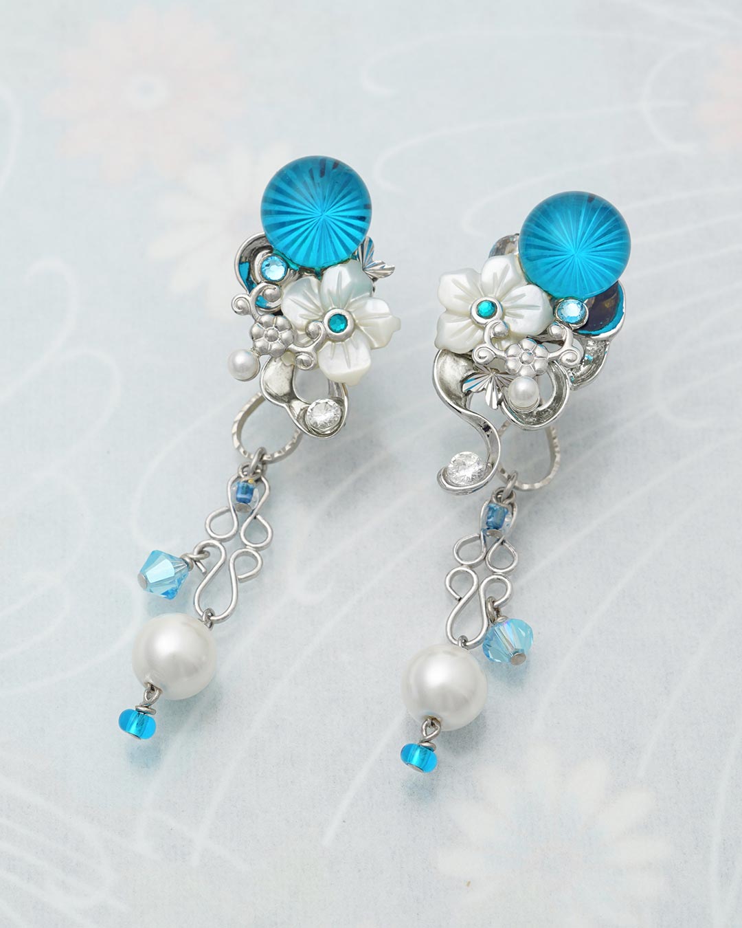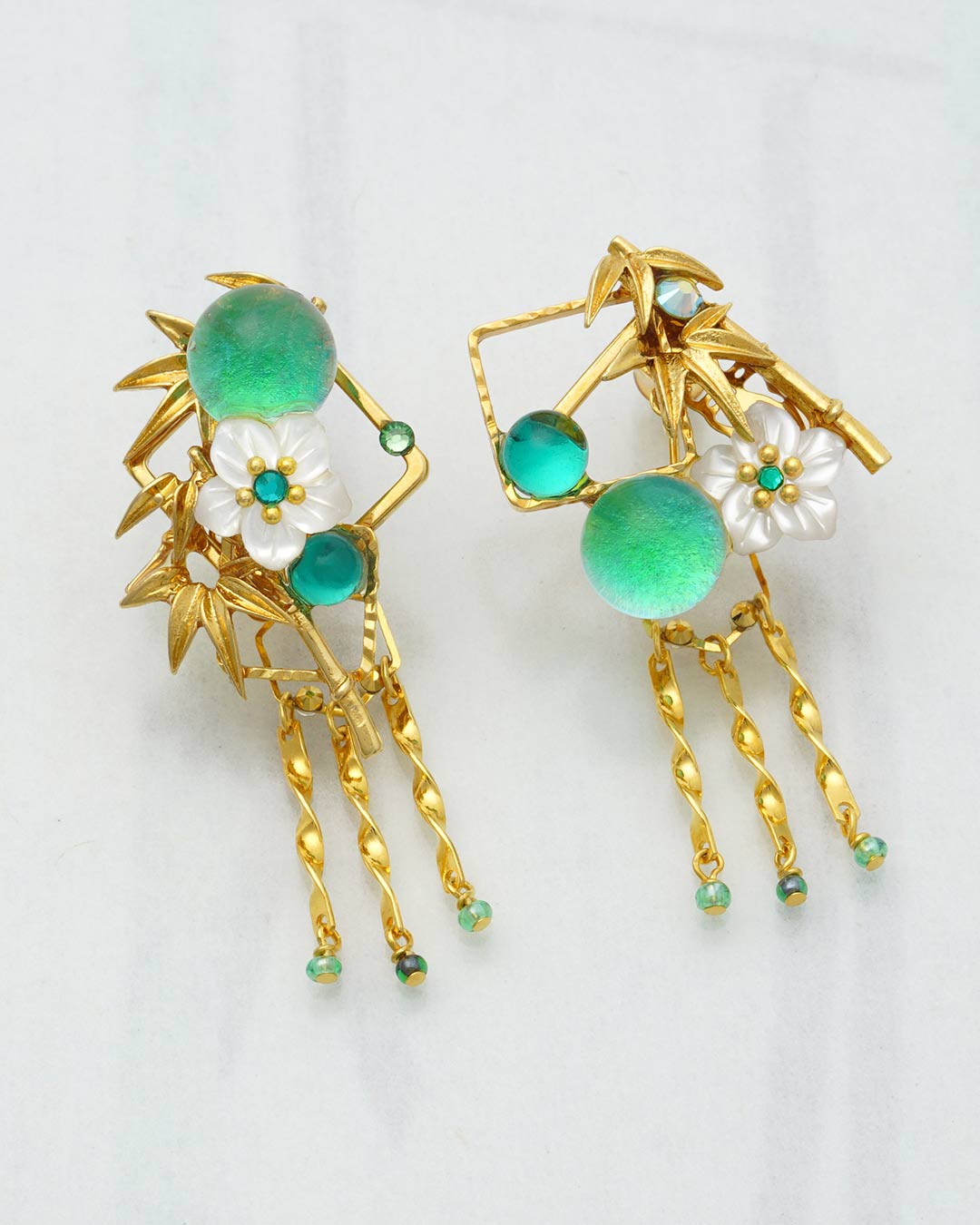 「竹取物語」に登場するかぐや姫をモチーフにした、和の雰囲気ただよう華やかなデザインです。瑞々しい竹を感じさせる爽やかなグリーンのガラスが、きらめく竹のモチーフとともに印象的な耳元を演出します。