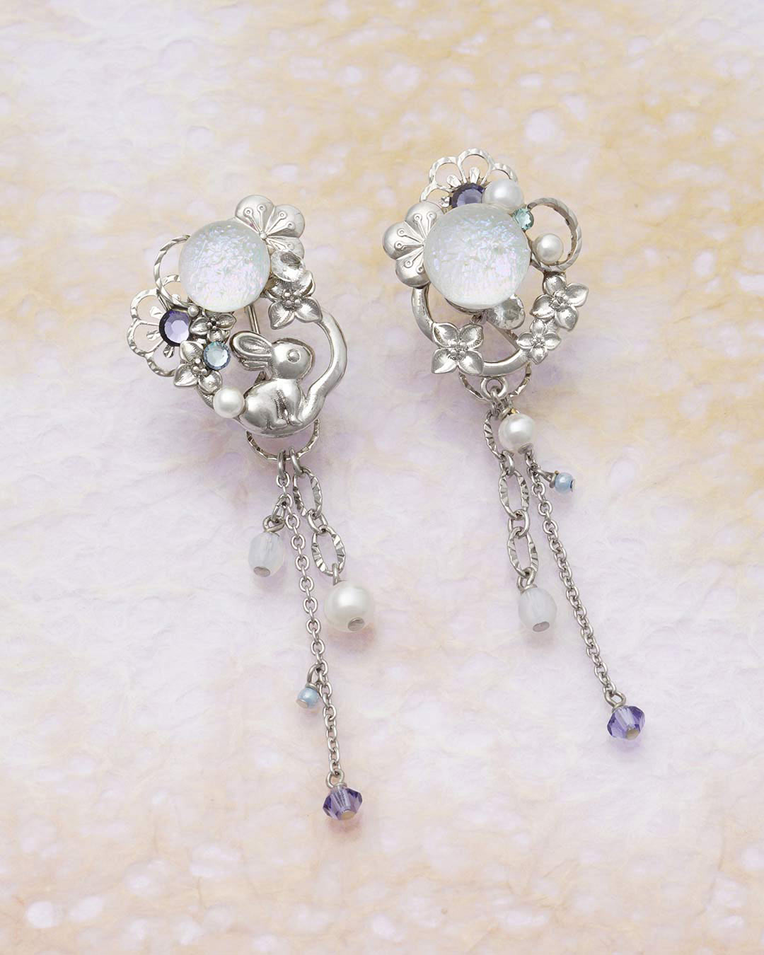 日本神話のひとつ「因幡の白兎」をモチーフに、物語の世界観を愛らしくも幻想的に表現したデザイン。主役の白うさぎは、物語の一場面を切り取ったかのようなフレームの中に立体的にデザインしました。真っ白なガラスとパールでうさぎの姿としっぽを、青いストーンとジルコニアでうさぎの涙の輝きを表現しています。チェーンは海の泡をイメージしており、神様を象徴する神秘的な色として紫のストーンを配置しました。
