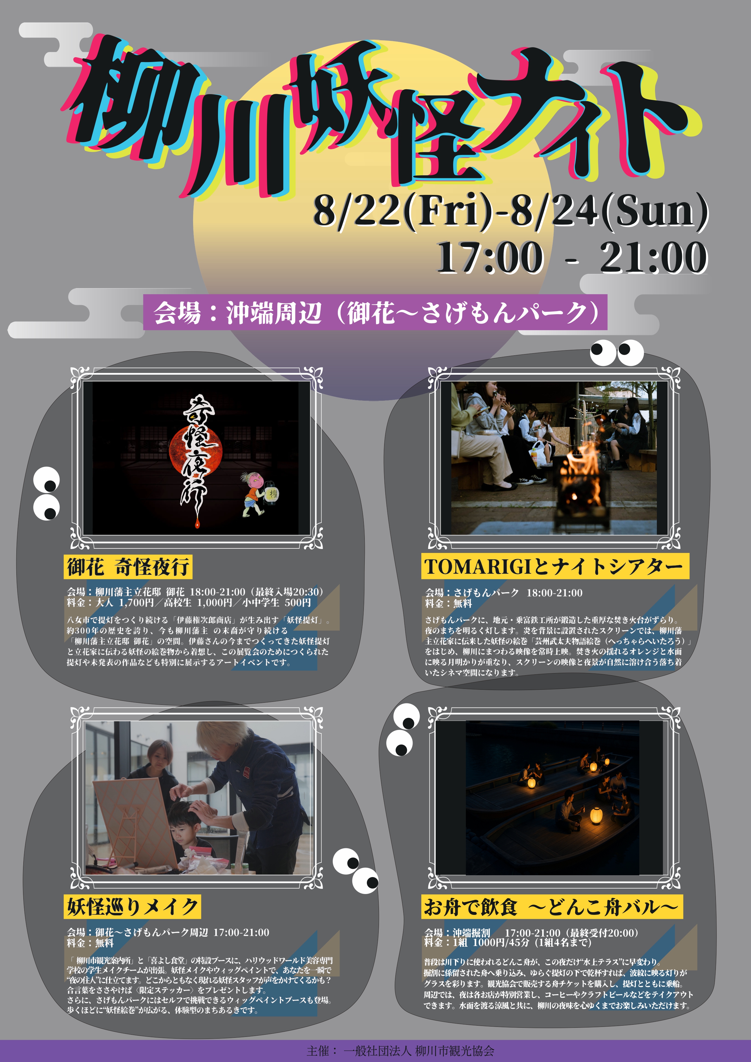 柳川一般社団法人市観光協会(福岡県柳川市)は、2025年8月22日(金)〜24日(日)の3日間、柳川・沖端エリアで夜のまちを楽しむイベント 「柳川妖怪ナイト」 を開催します。