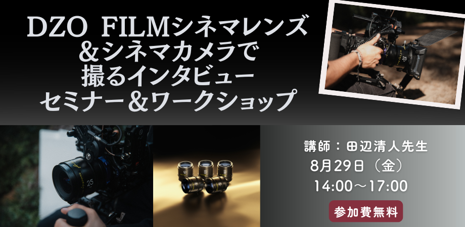 株式会社プロ機材ドットコム(本社:沖縄県那覇市)は、2025 年 8 月 29 日(金)にパンダスタジオ浜町 7F にて、「DZO FILMシネマレンズ&シネマカメラで撮るインタビュー:セミナー&ワークショップ」を開催します。近年、配信番組や企業VP、SNSコンテンツなど、あらゆる映像制作の現場で「映画的なルック」が求められています。本講座では、撮影現場でのセッティングからライティング、カメラワーク、音声収録、ポストプロダクションまで、現場さながらのフローを実践形式で学ぶことができます。映像制作のクオリティ向上を目指す方必見の内容です。
