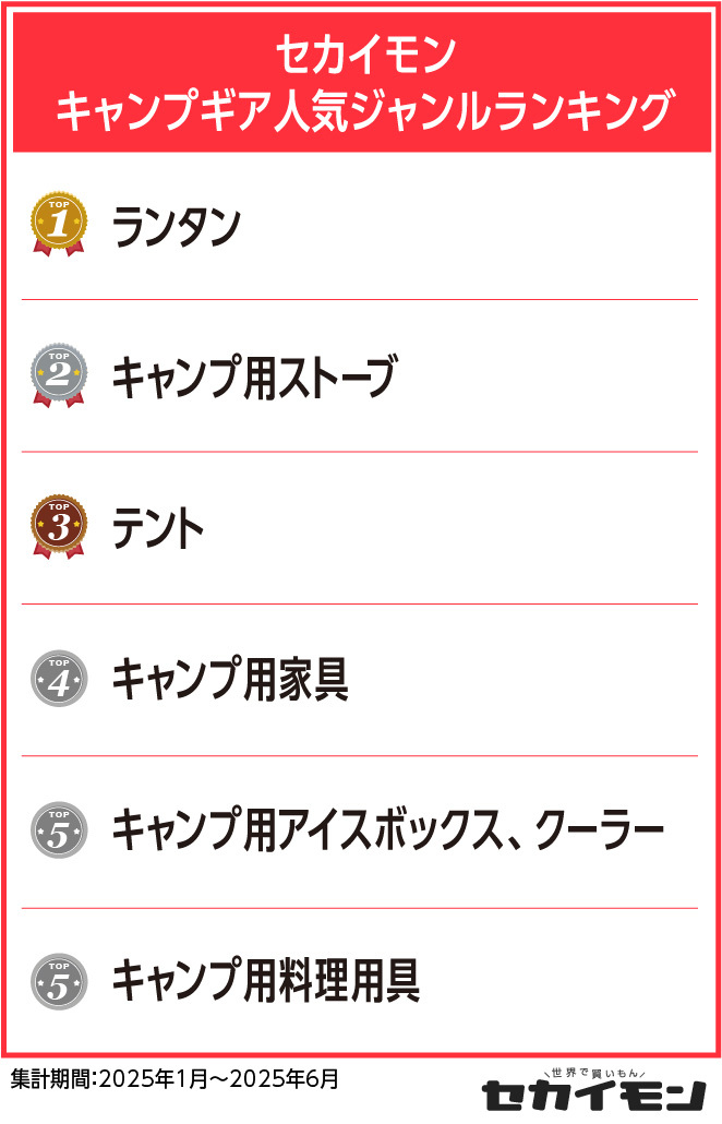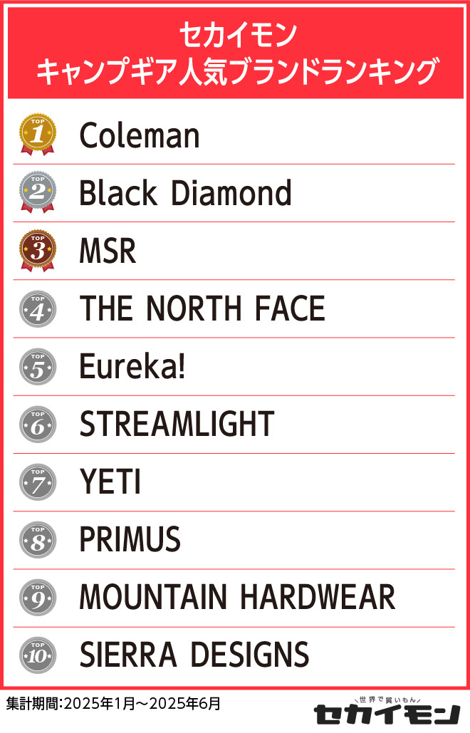 BEENOS株式会社の連結子会社である株式会社ショップエアライン(本社:東京都品川区 代表取締役社長:竹内拓)およびその海外子会社(以下、合わせて「SAL」)が運営する世界最大のオンラインマーケットプレイス「eBay(イーベイ)」公認の日本向けショッピングサイト「セカイモン」(https://www.sekaimon.com/ )は、【セカイモンHitランキング】として日本人が海外eBayで買っている「キャンプギア」人気ブランド&ジャンルを発表いたします(集計期間:2025年1月~2025年6月)。