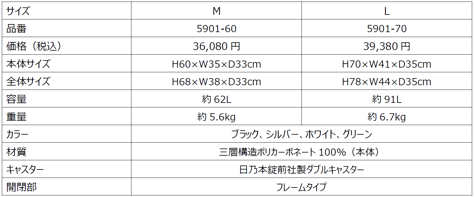 カラーはブラック、シルバー、ホワイト、グリーンの4色で、各色Mサイズ(5~7泊向け)とLサイズ(7泊~向け)の2サイズ展開。価格はMサイズが36,080円、Lサイズが39,380円(いずれも税込)です。