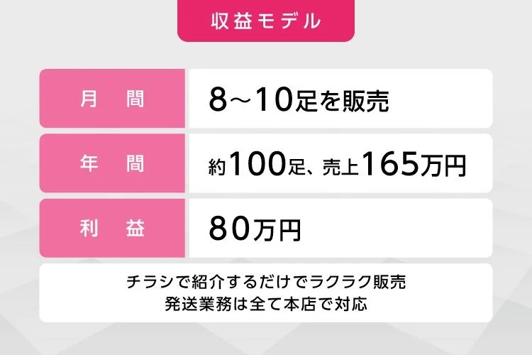 仕入なしで始められ、在庫を抱えることもないため低リスクでスタートできるほか、販促素材も一式提供。