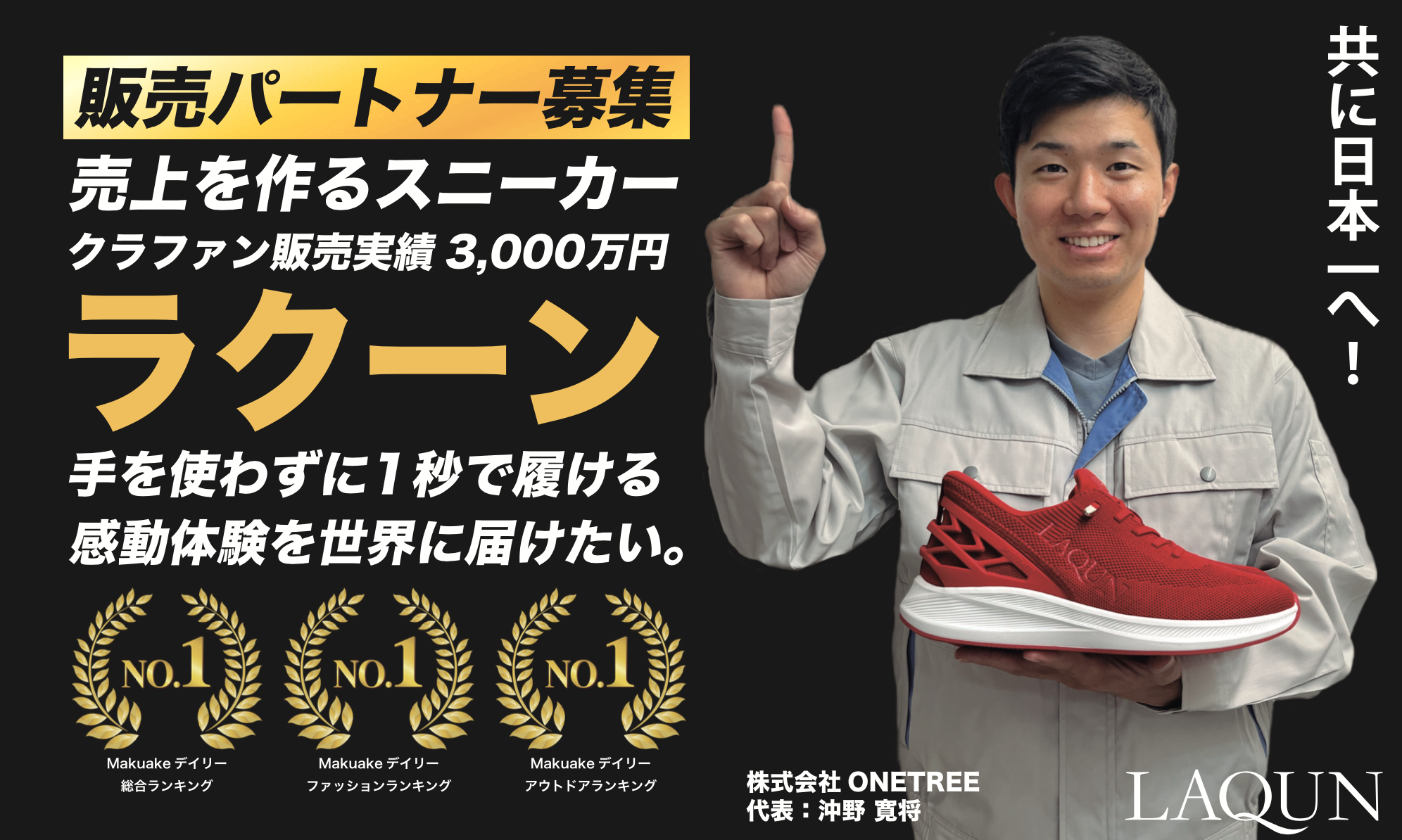 株式会社 ONETREE(本社:東京都台東区、代表取締役:沖野寛将)は、自社が企画・販売する1秒で履けるスニーカーLAQUN(ラクーン)の販売パートナーの1次募集をスタートします。