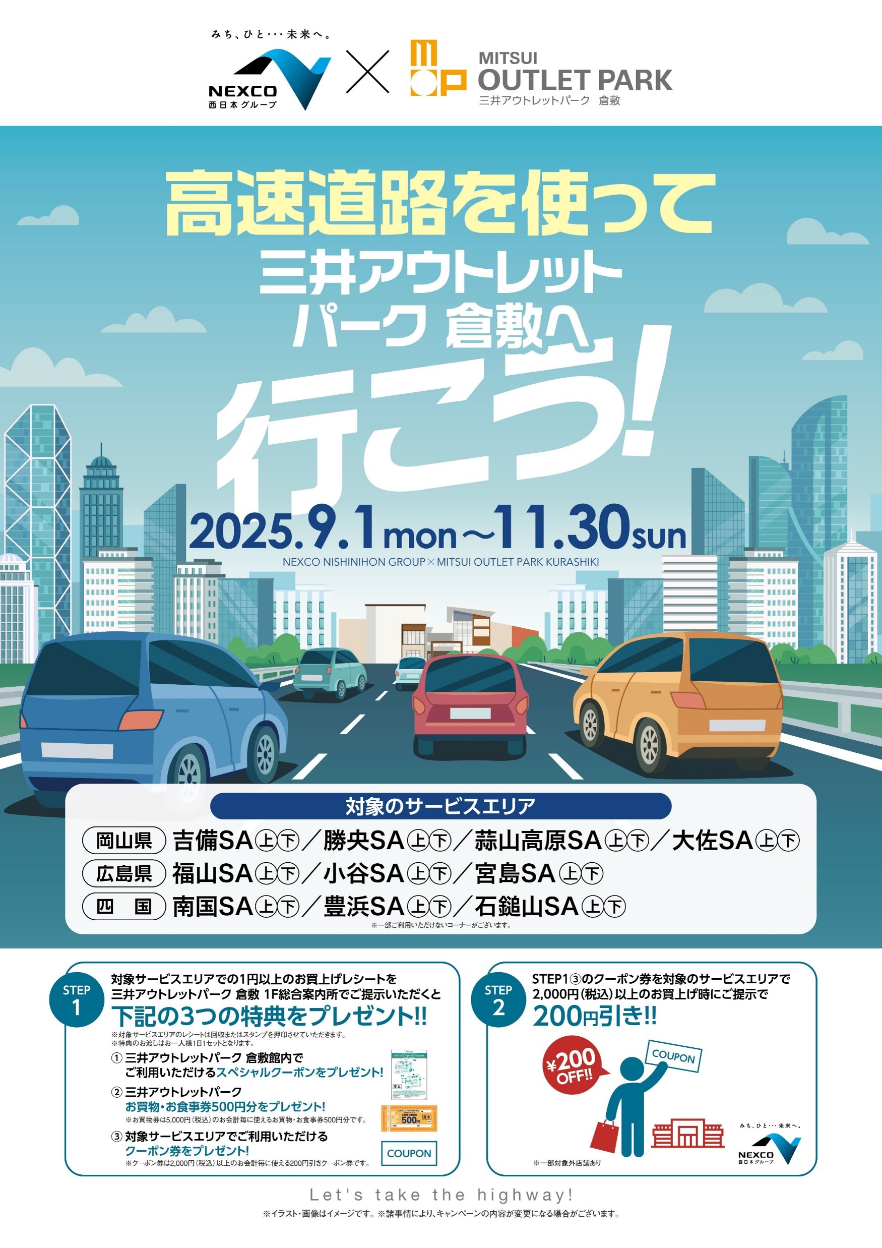 「高速道路を使って三井アウトレットパーク 倉敷へ行こう!」を実施します ~三井アウトレットパークとSAで使えるお得なクーポンをプレゼント!~