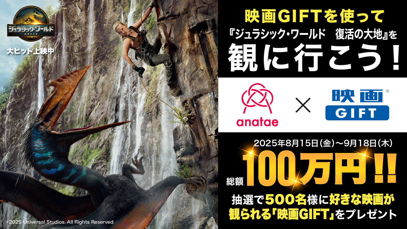 株式会社ムービーウォーカー(本社:東京都千代田区、代表取締役社長:五十嵐淳之)は、体験ギフト・マーケットプレイス「anatae(あなたへ)」を運営するANATAE株式会社(本社:東京都目黒区、代表取締役:堀田栄利康)が2025年8月15日(金)から9月18日(木)まで、抽選で映画GIFTが当たるプレゼントキャンペーンを共催で実施しています。