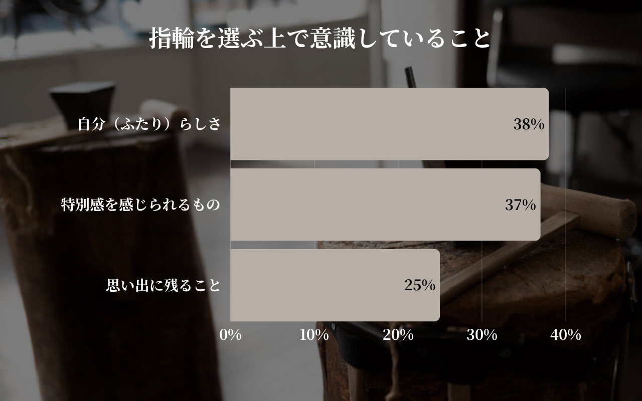 指輪選びにおいて最も重視されているのは「自分(ふたり)らしさ」(38%)で、パートナーとの関係性や価値観を反映できる特別なかたちを求めていることがうかがえます。次いで「特別感を感じられるもの」(37%)が続いており、日常とは異なる大切な節目にふさわしい存在として選ばれている様子が見て取れます。また、「思い出に残ること」(25%)も重視されており、体験そのものが記憶に残る時間であることが、選ばれる理由のひとつになっていると考えられます。
