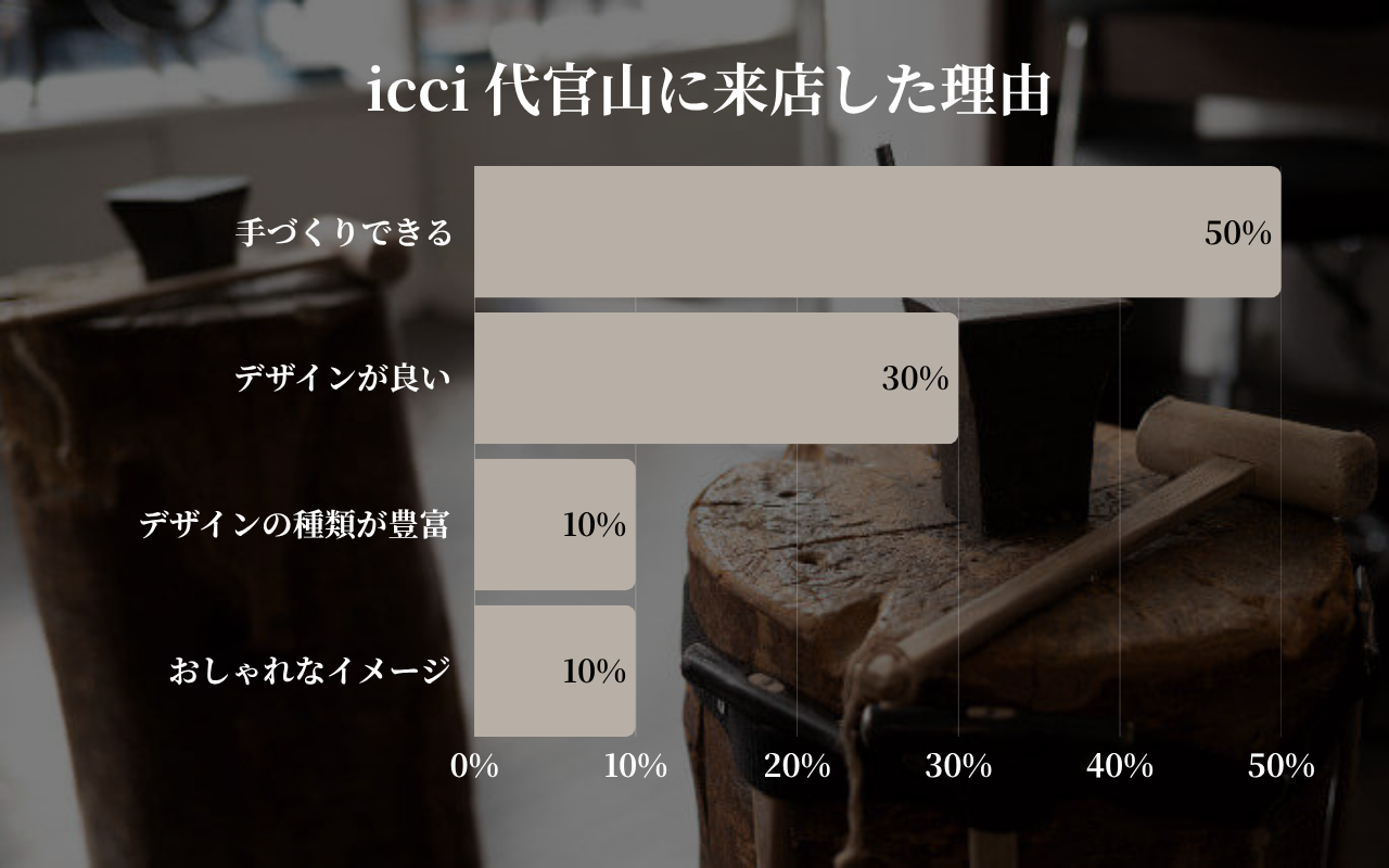来店理由として最も多かったのは「手づくりできる」(50%)で、体験型のサービスに強い魅力を感じていることがわかります。「デザインが良い」(30%)も高評価を得ており、感性に合った指輪づくりへの期待がうかがえます。「デザインの種類が豊富」「おしゃれなイメージ」(各10%)も支持されており、機能性とビジュアル両面での満足度の高さが特徴です。