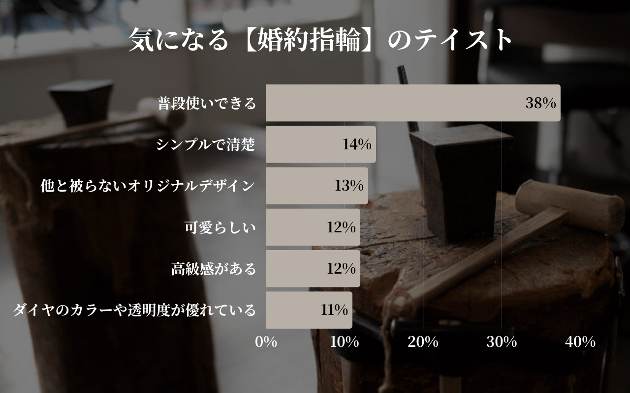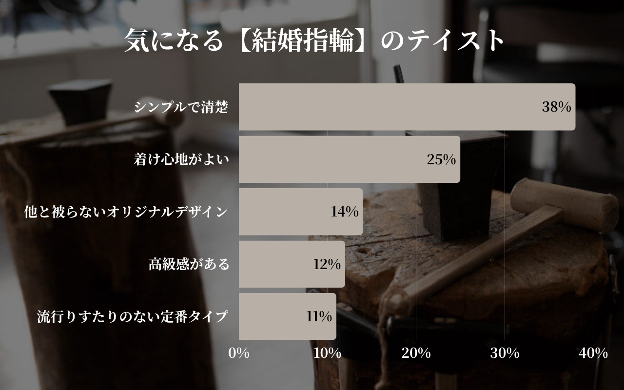 結婚指輪のテイストでは「シンプルで清楚」(38%)が最も支持されており、上品で飽きのこないデザインが求められていることが分かります。「着け心地がよい」(25%)も高い割合を占めており、長く身につけるものとして快適さを重視する傾向も見受けられます。全体として、普遍的な美しさと実用性を兼ね備えた指輪が選ばれやすい結果となりました。