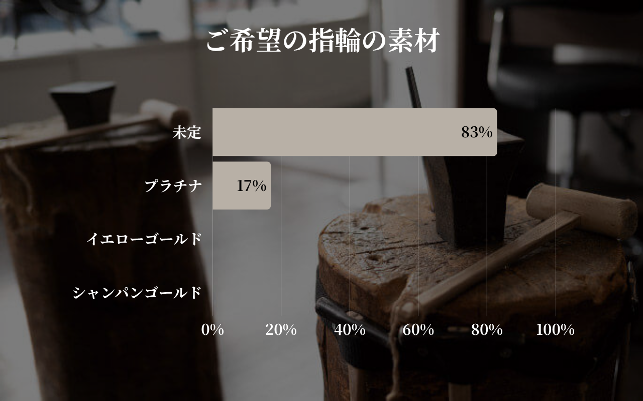 素材に関する回答では「未定」(83%)が大多数を占めており、多くの方が店頭で実物を見ながら選びたいと考えていることがうかがえます。一方、「プラチナ」(17%)は具体的な希望として一定の支持があり、定番素材として根強い人気を保っています。選択肢を比較しながら納得のいく素材を選びたいという姿勢が感じられます。