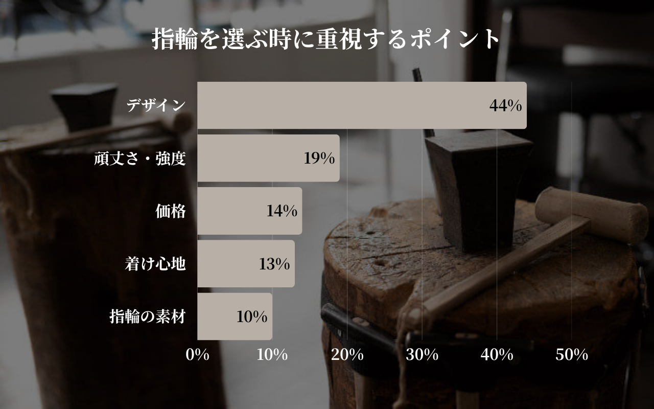 指輪を選ぶ際に最も重視されているのは「デザイン」(44%)で、自分らしさや見た目の美しさを大切にする傾向がうかがえます。「頑丈さ・強度」(19%)や「価格」(14%)も続いており、長く使うことを前提とした実用性や予算とのバランスも意識されていることが分かります。全体として、見た目と実用性の両面を重視する傾向が見られました。