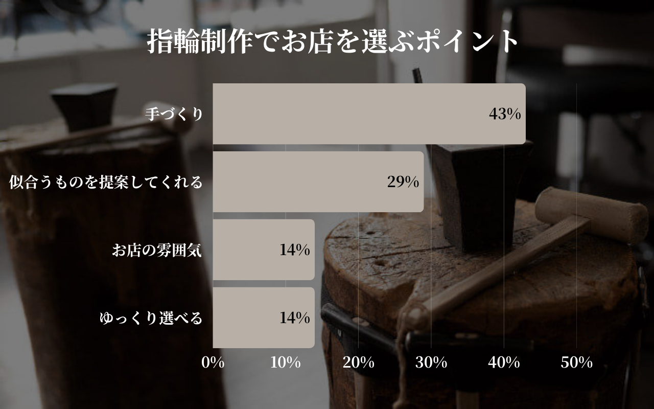 指輪制作でお店を選ぶ際に重視されるポイントとして「手づくり」(43%)が最多となり、体験型の魅力が強く支持されていることが分かります。「似合うものを提案してくれる」(29%)も高く、専門的なアドバイスを求める声が目立ちました。また「雰囲気」や「ゆっくり選べる環境」(各14%)も選ばれており、安心感や丁寧な接客も重要視されていることがうかがえます。
