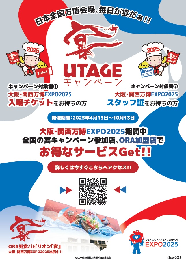 SRSホールディングス株式会社(本社:大阪府大阪市、代表取締役社長:重里 政彦、以下SRSグループと記載します)は、一般社団法人大阪外食産業協会(以下、ORAと記載します)が開催する「宴キャンペーン」に参加しております。当社はORA理事企業であり、ORAは、大阪・関西万博EXPO2025内のパビリオン「宴~UTAGE~」において外食産業の新しい形を提案し、食文化の魅力を世界に発信することを目指しています。