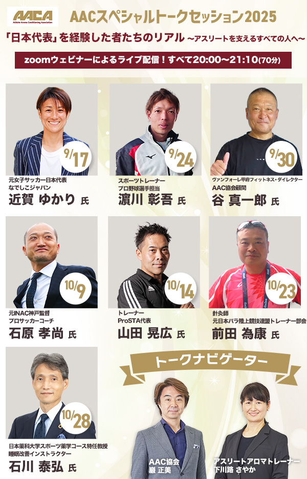 スポーツに励む人がケガ故障で 苦しむことのない世界へ。スポーツに励む人の日ごろの努力が報われるよう 「体と心を整える」コンディショニング方法を普及することで 日本のスポーツ、アスリートのさらなる繁栄への貢献を目指すAAC協会。多くの識者・アスリートに支えられ活動を続けています。今回は長年の協力関係にある識者・アスリートと共にイベントを開催します。