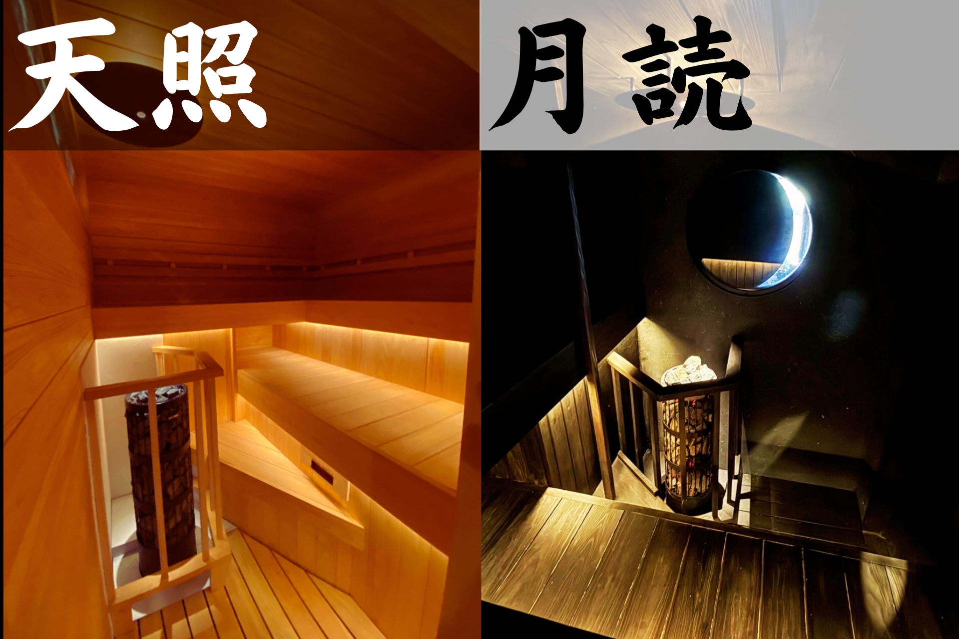 施設には2種類のサウナがあり、明るく開放的な「天照」は最大5名まで利用可能な広々とした空間が魅力。一方、黒を基調とした「月読」には月をモチーフにした窓が設けられ、三日月や半月のように変化する光の演出が楽しめる。