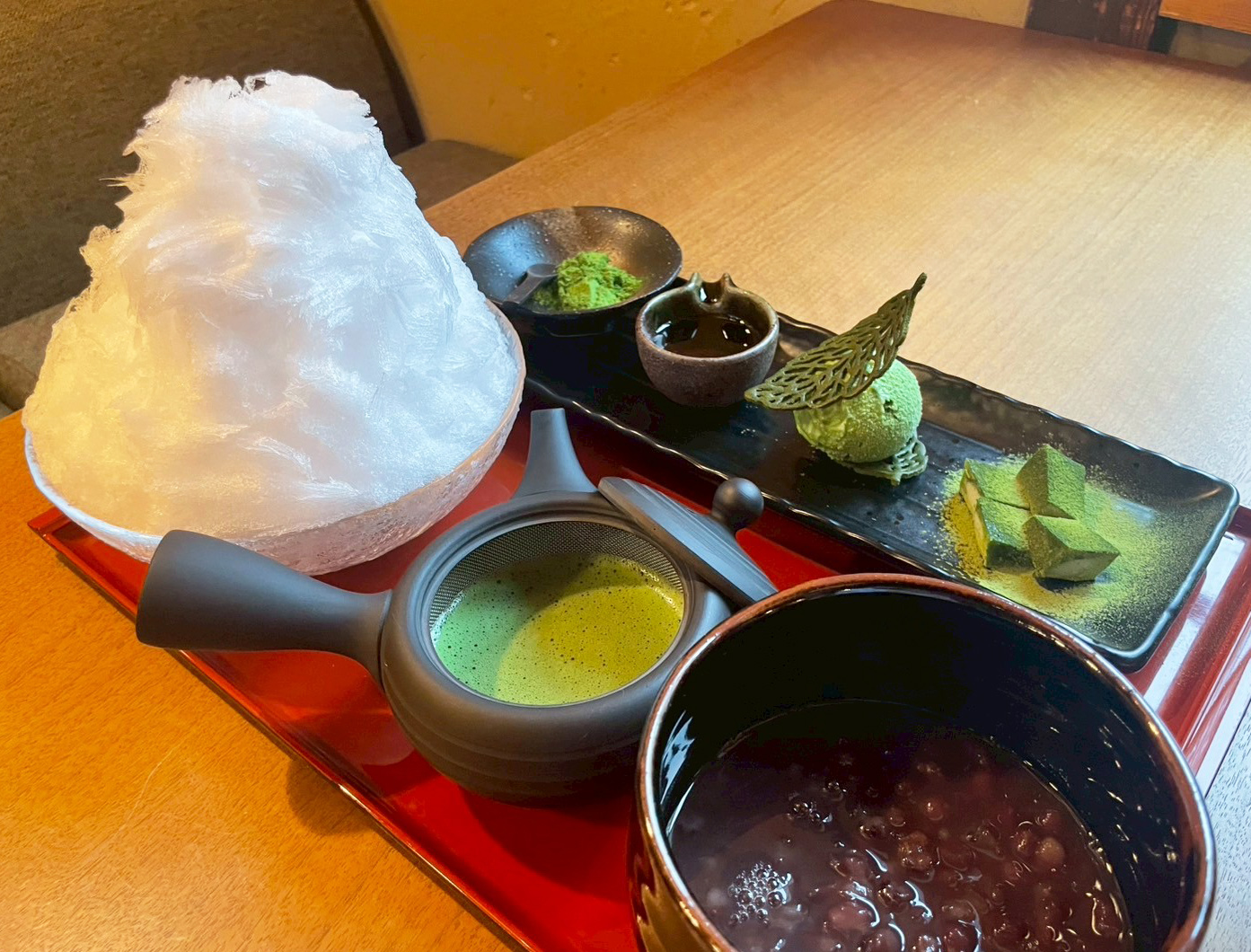 特製の冷やし小豆を添えた茶器に、氷や凍りわらび餅、抹茶ジェラート、抹茶を注げば「冷やし抹茶ぜんざい」としてもう一品楽しめる宇治抹茶づくしの贅沢な構成です。