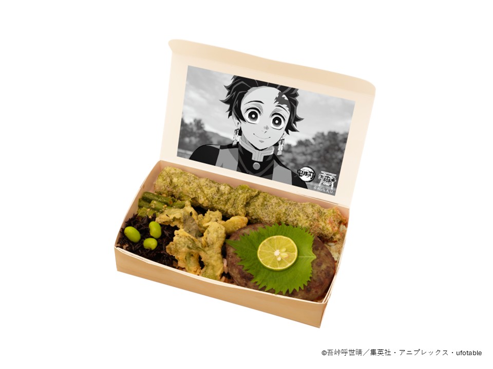 公開中の『劇場版「鬼滅の刃」無限城編 第一章 猗窩座再来』。本作に登場する竈門炭治郎をイメージした素材と味にこだわった海苔弁。大葉とおろしポン酢でさっぱり食べるハンバーグを主役に、緑をテーマにした爽やかなお弁当です。