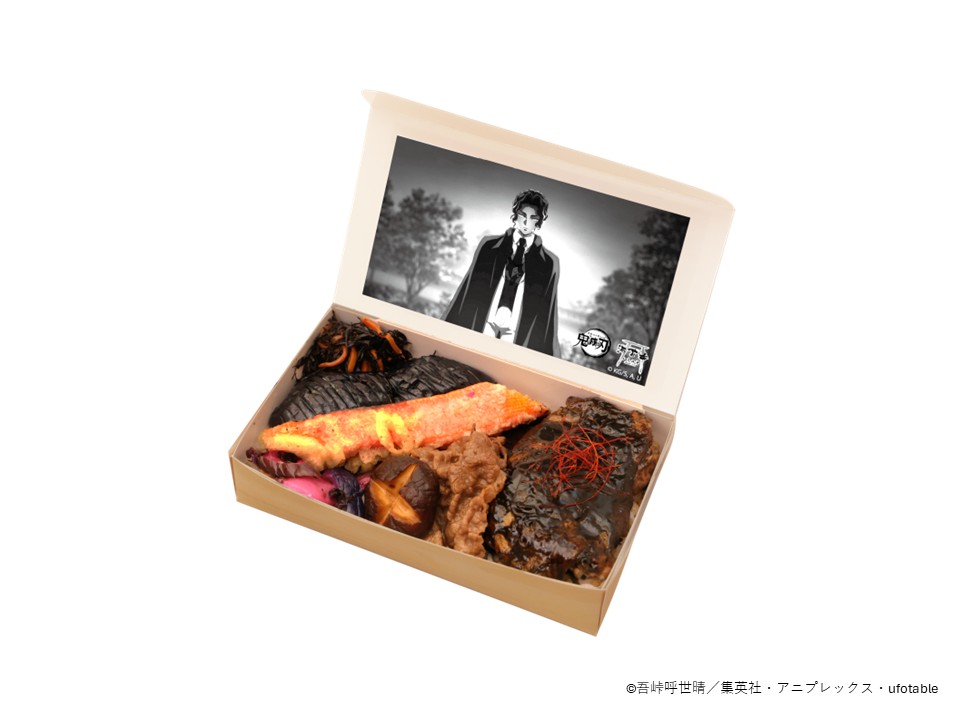 公開中の『劇場版「鬼滅の刃」無限城編 第一章 猗窩座再来』。本作に登場する無惨をイメージした素材と味にこだわった海苔弁。イカ墨ソースの照り焼きなどが入った、味と食感のコントラストが光る海苔弁。