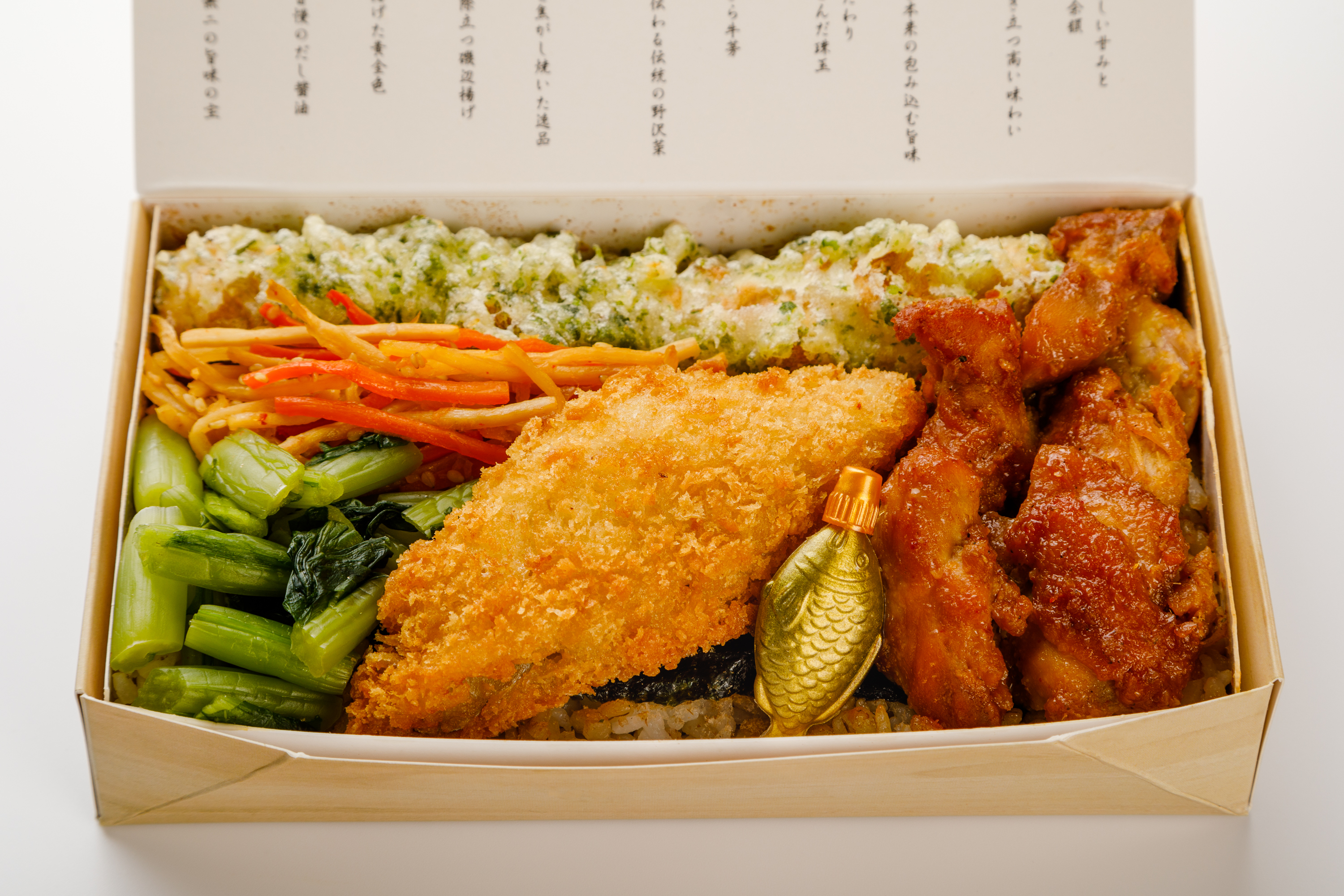 新潟県産の新之助米を使ったふっくらとした白飯に、濃厚な味わいの手づくり味玉をトッピング。瀬戸内海産の風味豊かな海苔と、低温調理でジューシーに仕上げた白身フライがマッチします。鶏味噌焼きやちくわの磯部揚げなど、地域の味も楽しむことができる、お腹も心も満たされる至福のお弁当です。