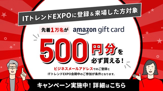 今回、ITトレンドEXPOに参加登録をしていただいた先着1万名様に、Amazonギフトカード500円分をもれなくプレゼントいたします。※「ビジネスメールアドレスでの参加登録」と「開催期間中のご参加」が条件となります。