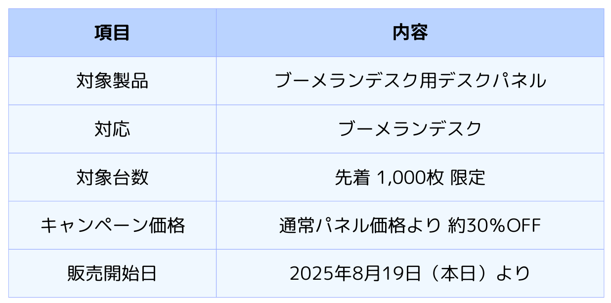 ブーメランデスク用デスクパネル 発売&先着1,000枚限定 割引キャンペーン開始